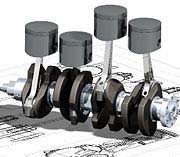 An oblique view of a four-cylinder inline crankshaft with pistons.