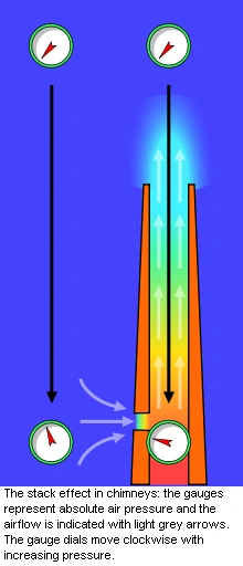 The combustion flue gases inside the chimneys or stacks are much hotter than the ambient outside air and therefore less dense than the ambient air. That causes the bottom of the vertical column of hot flue gas to have a lower pressure than the pressure at the bottom of a corresponding column of outside air. That higher pressure outside the chimney is the driving force that moves the required combustion air into the combustion zone and also moves the flue gas up and out of the chimney. That movement or flow of combustion air and flue gas is called "natural draught/draft", "natural ventilation", "chimney effect", or "stack effect". The taller the stack, the more draught or draft is created.