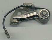 Breaker arm with contact points at the left. The pivot is on the right and the cam follower is in the middle of the breaker arm.