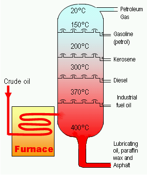 Crude oil is separated into fractions by fractional distillation. The fractioning column is cooler at the top than at the bottom so the vapours can condense more easily while the moving up the column. The heavier fractions that emerge from the bottom of the fractionating column are often broken up (cracked) to make more useful products.