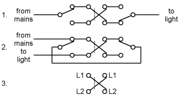 The second method is to join the three terminals of one switch to the corresponding terminals on the other switch and take the incoming supply and the wire out to the light to the L1 and L2 terminals. Through one switch A connects to B or C, through the other also to B or C; the light is on if B connects to C, i.e. if A connects to B with one switch and to C with the other.