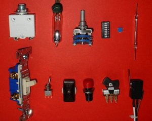 Electrical switches. Top, left to right: circuit breaker, mercury switch, wafer switch, DIP switch, surface mount switch, reed switch. Bottom, left to right: wall switch (U.S. style), miniature toggle switch, in-line switch, push-button switch, rocker switch, microswitch.