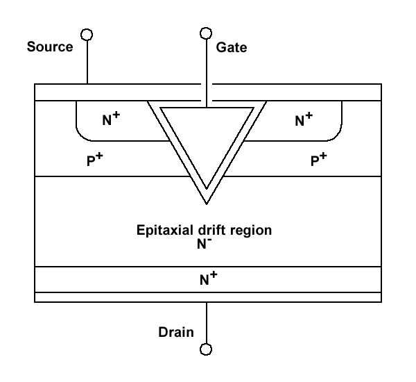 During operation in blocking mode, the highest electric field occurs at the N+/p+ junction. The presence of a sharp corner at the bottom of the groove enhances the electric field at the edge of the channel in the depletion region, thus reducing the breakdown voltage of the device.[2] This electric field launches electrons into the gate oxide and consequently, the trapped electrons shift the threshold voltage of the MOSFET. For this reason, the V-groove architecture is no longer used in commercial devices.