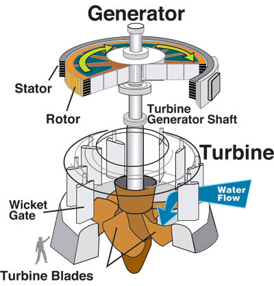 Kaplan turbine and electrical generator cut-away view.